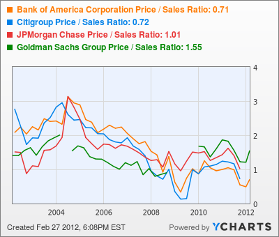 Mely részvényekre érdemes itt különösen figyelni? A szűk lista, a részvénykódokkal: BAC, C, JPM, PNC, WFC, COF, HBC. Látható, hogy igen nagy nevek vannak a listán, és érdekességük, hogy mindegyikük a könyv szerinti érték alatt van. Más szóval: ha a számok stimmelnek, minden behajtható éppen azon az áron, ahogy a mérleg alapját képező értékeléseben szerepel, és ez azonnal ezen az áron értékesíthető is lenne, akkor a teljes bankot felvásárló képzelt milliárdos kockázatmentes nyereségre tehetne szert. Helyenként nem is kicsire. A Bank of America kevesebb mint 40%-át éri, mint amennyit a - kockázatokat nem kalkulálva - érnie kellene. A Citigroup 42%-ot. A tájékozatlan nagyközönség által rettegett Goldman Sach (amely ugyan nem globális kereskedelmi bank, de nem áll messze ettől) 67%-ot. Még a Warren Buffett által tartott, a válság idején is híresen stabil Wells Fargo kapitlizációja is pár százalékkel a saját tőke alatt van. Ráadásul jól látható, hogy az értékelés a pénzügyi válság legsötétebb óráit idézi, és ugyanez a helyzet az itt kevéssé releváns, de időbeli összevetésben érdekes árbevételhez mérő mutató esetén is (második kép).